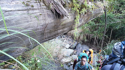 8:59 前方遇到斷崖,就在0.4K木樁過後沒多久,右方有條溪溝,前方無法通行,決定高遶,之後就幾乎是種停在最前面探路,我們跟著走,幾乎就是一路找路,也沒甚麼特別大的地標,所以幾乎無紀錄。